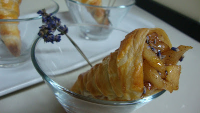 No fim do jantar, e por ser sábado, dia de manjar dos Deuses, não apetecia só o cafezito para selar a nossa fantástica refeição, por isso houve mudança de planos quanto ao futuro das cornucópias, e em vez de salgados, deram origem a um delicioso acompanhamento doce e delicado para o nosso aveludado café Nespresso: Cornucópias de maçã e lavanda.